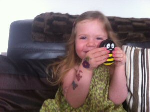 bloods are never easy, but the little bee in her hand is called Buzzy & he helps. He's a vibrating bee with